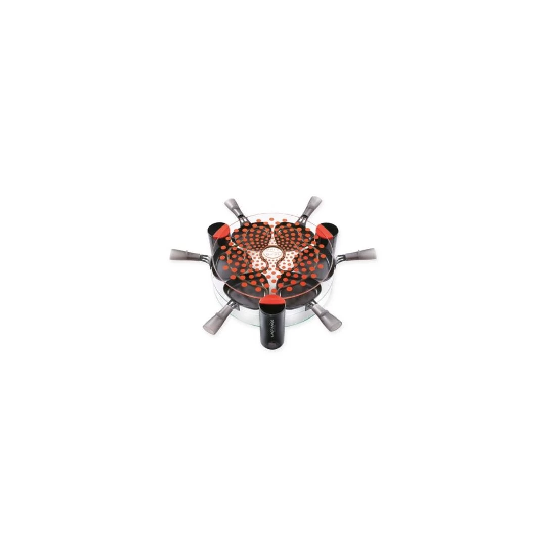 L’ensemble à raclette Vitro se distingue de nombre d’ensembles similaires en raison des matériaux qui constituent son corps et son design. Les plateaux en verre sont d’excellents conducteurs de chaleur, si bien qu’il est possible de griller des aliments sur le plateau supérieur et de maintenir au chaud poêlons et aliments sur le plateau inférieur.