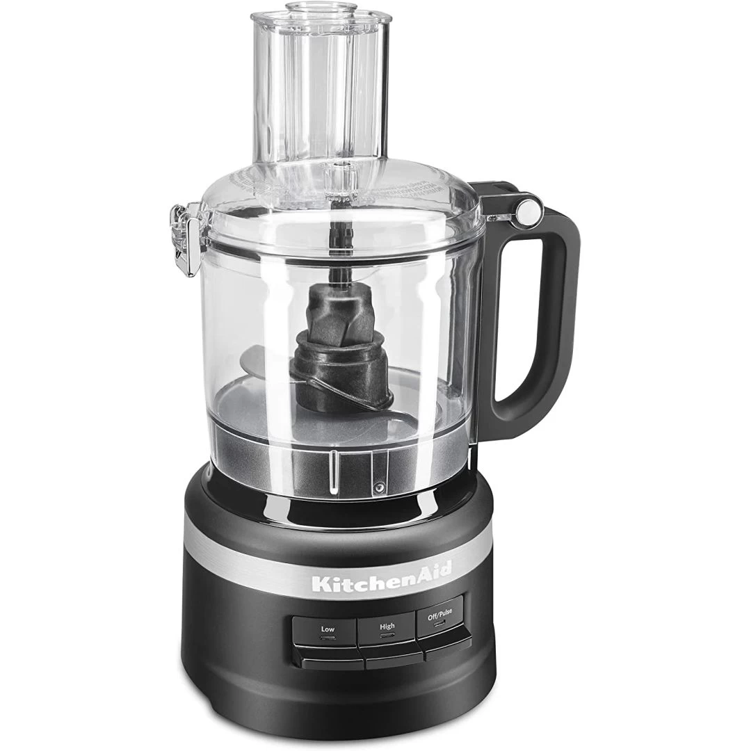 Ce robot culinaire de KitchenAid est plutôt conventionnel; un récipient de grande capacité, des disques de coupe, trois vitesses. Ce qui le distingue de nombreux modèles similaires, c’est son couvercle, attaché au récipient, et qui est amovible, et le design du récipient, grâce auquel le disque de coupe et la lame peuvent être rangés dans le récipient.